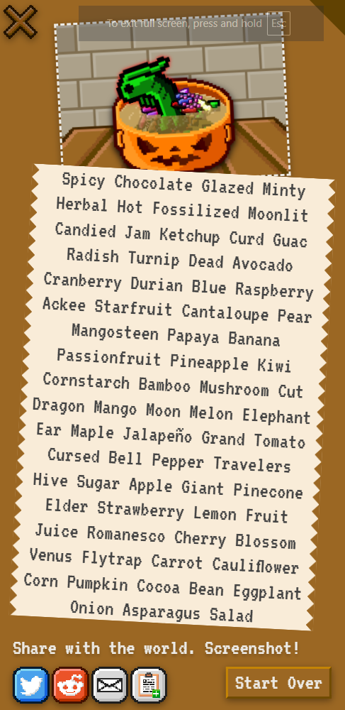 Loved the game! Would have loved if there was music and sound effects though. The pixel art was great. Also a better system for searching for items would be nice as sometimes I just want to browse through ingredients to see what's possible and don't want to search for something specific.